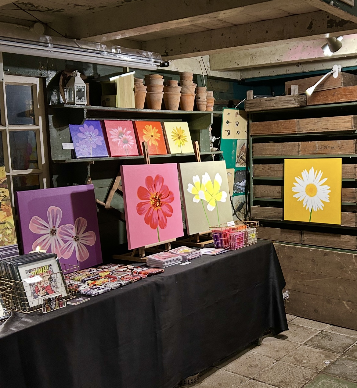 Een origineel bloemenschilderij van 50 x 50 cm geschilderd met acrylverf ( slechts 8 stuks van beschikbaar) en een set van 4 gesigneerde en genummerde kwaliteitsprints op canvas ( 25 x 25 cm) naar keuze, 1 per seizoen ( oplage van 30 stuks). De bloemen worden geleverd inclusief een korte inhoudelijke toelichting over de betreffende bloem. Tevens ontvang je bij de bestelling een gratis set bloem-ansichtkaarten met enveloppe ( 10 stuks).