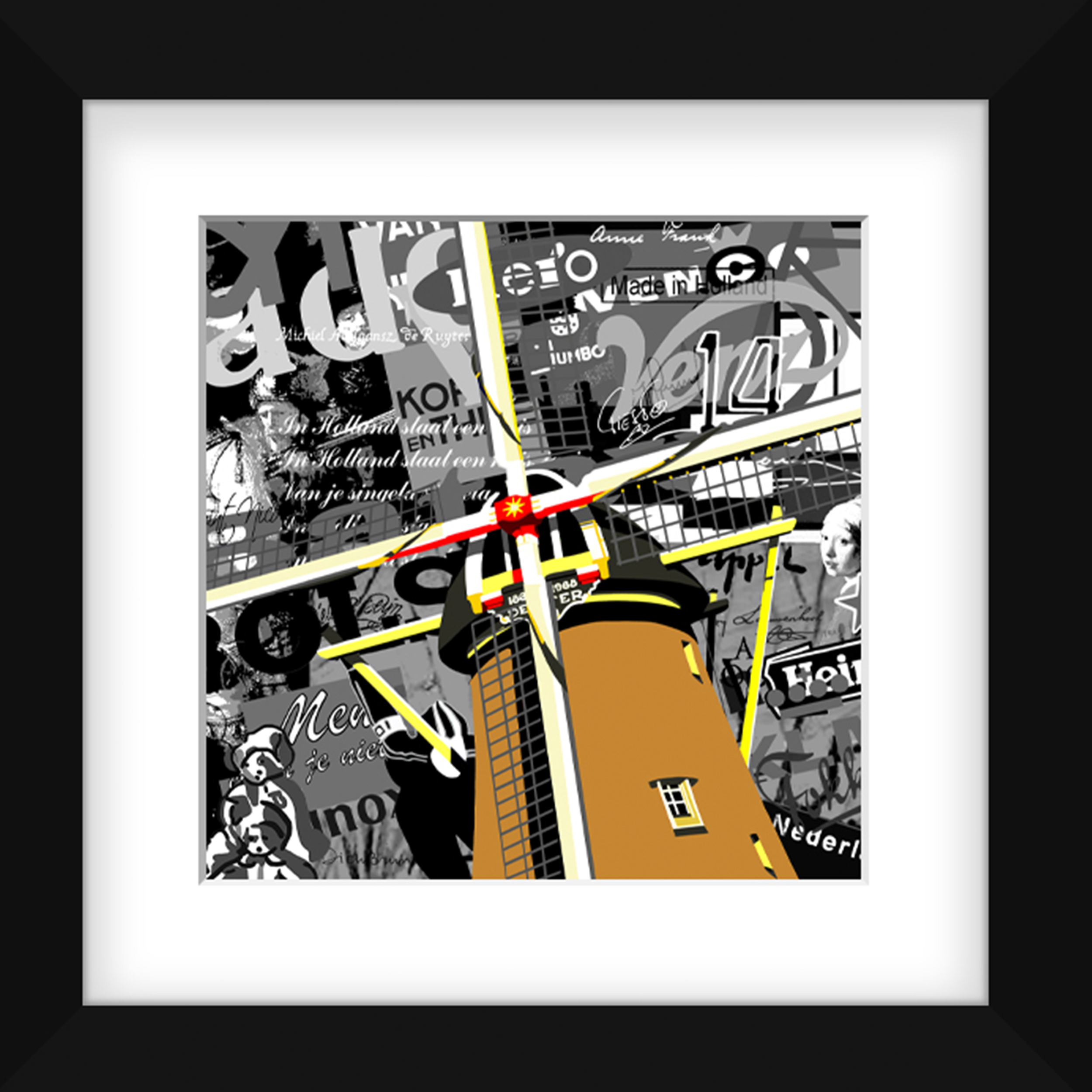 A Dutch Windmill painted on a background of the most famous Dutch brands, people, items, paintings and customs, printed on cotton paper and framed with a passe-partout measuring in a frame of 20 x 20 x 3 cm, signed and numbered (edition is 30 pieces). Costs are € 95.00 (excl. transport).