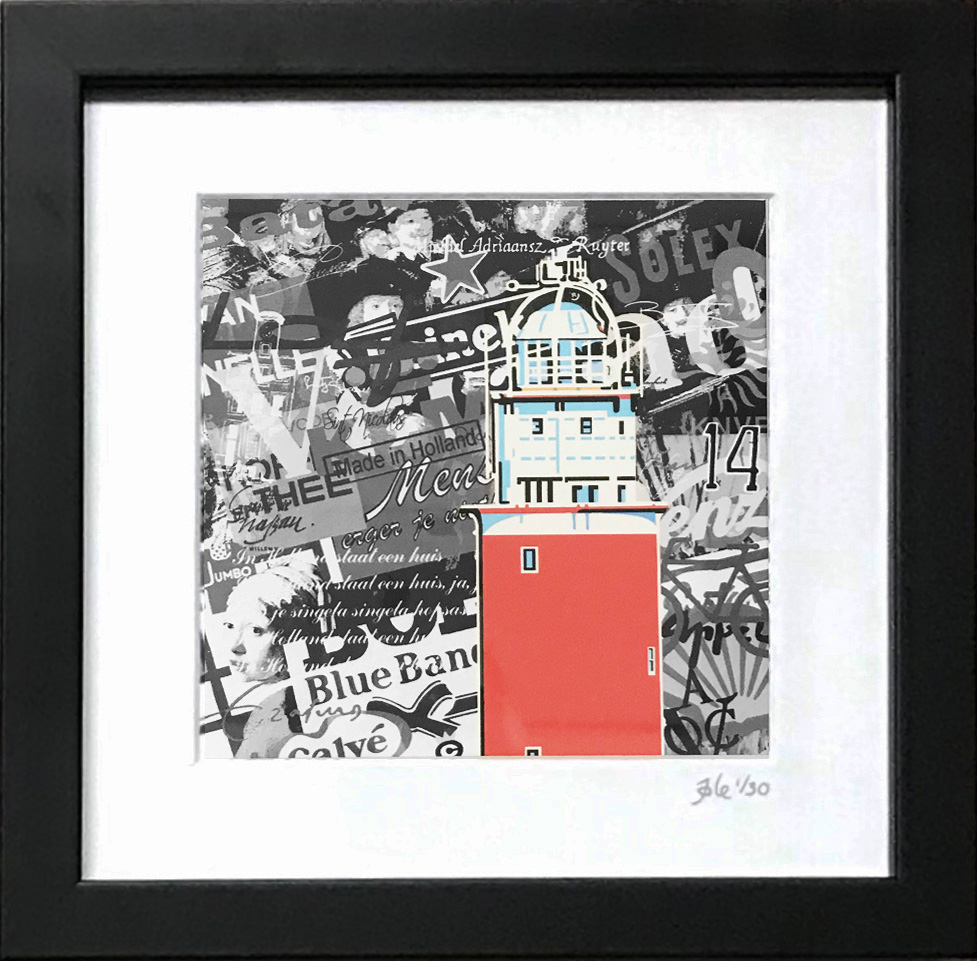 Een vuurtoren getekend op een geprinte achtergrond van de beroemdste Nederlandse merken, mensen, items, schilderijen en gebruiken, afgedrukt op katoenpapier en ingelijst met passe-partout in een lijst van 20 x 20 x 3 cm, gesigneerd en genummerd (oplage is 30 stuks).