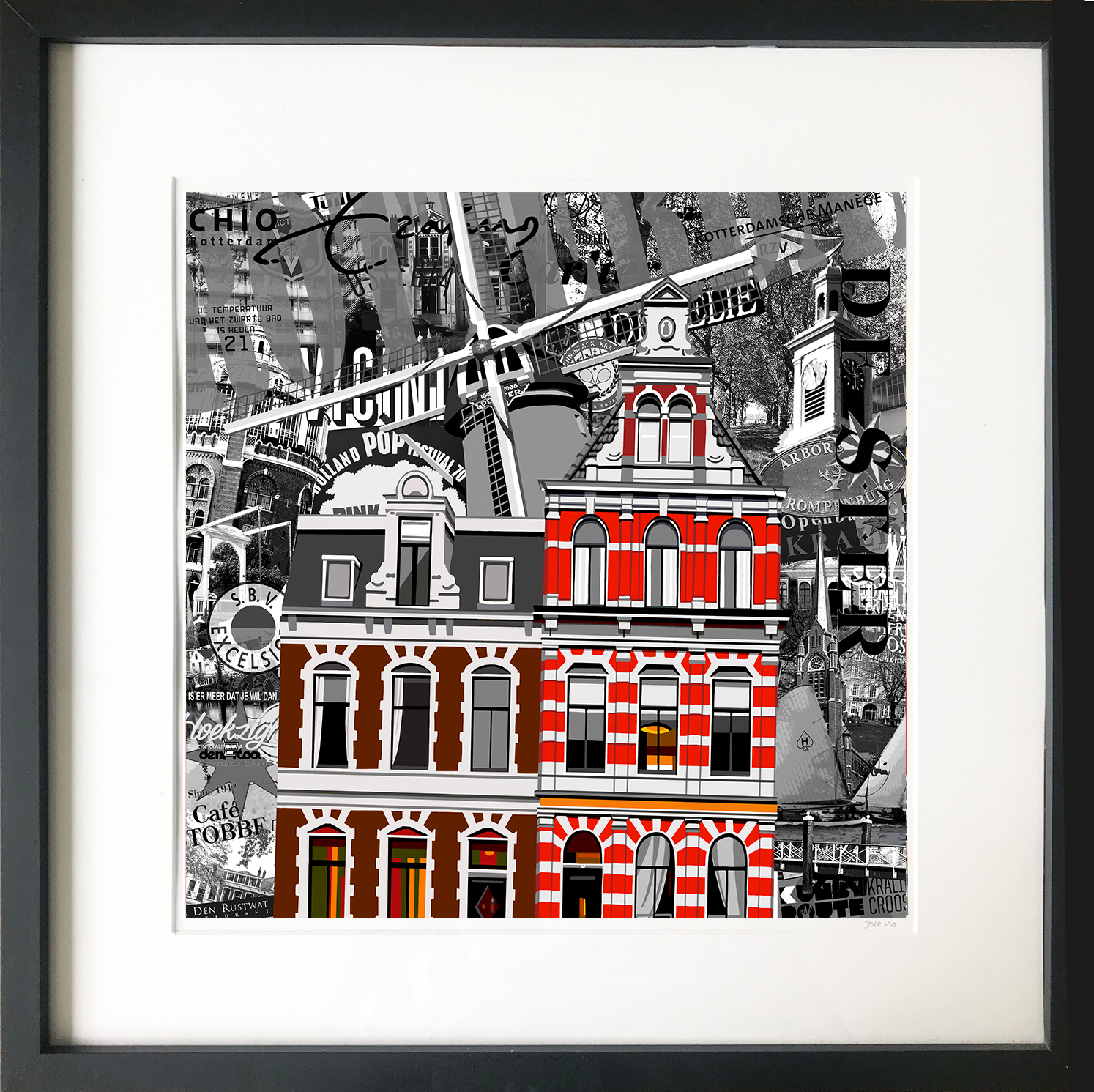 Twee Kralingse huizen getekend op een achtergrond van alle bijzonderheden van Kralingen van toen en nu bij elkaar verzameld. Van Hoflaankerk en Hofvijver tot aan de Watertoren en de Kralingse Plas, van popfestival tot CHIO. Met de bekendste Kralingse gebouwen en locaties waar je allemaal wel eens bent geweest..”. Afgedrukt op katoenpapier en ingelijst met passe-partout in een lijst van 50 x 50 x 3 cm, gesigneerd en genummerd (oplage is 10 stuks).