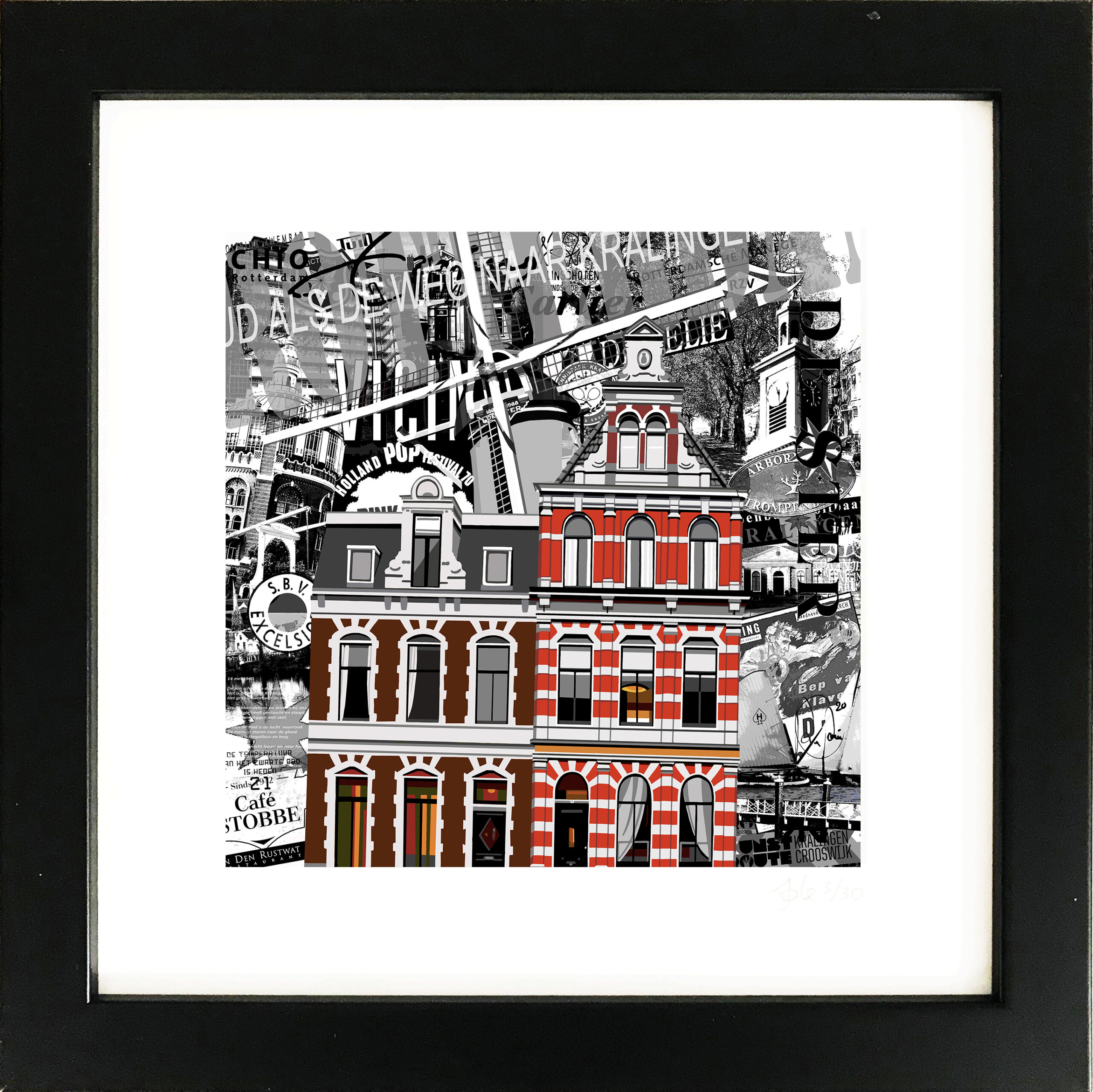 Twee Kralingse huizen getekend op een achtergrond van alle bijzonderheden van Kralingen van toen en nu bij elkaar verzameld. Van Hoflaankerk en Hofvijver tot aan de Watertoren en de Kralingse Plas, van popfestival tot CHIO. Met de bekendste Kralingse gebouwen en locaties waar je allemaal wel eens bent geweest..”. Afgedrukt op katoenpapier en ingelijst met passe-partout in een lijst van 20 x 20 x 3 cm, gesigneerd en genummerd (oplage is 30 stuks).