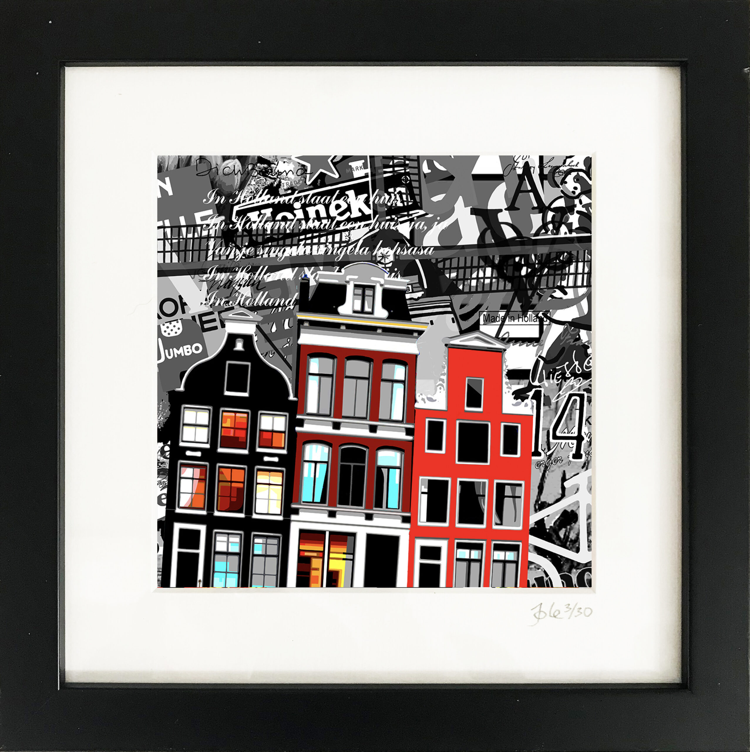Drie Amsterdamse grachtenpanden getekend op een achtergrond van de beroemdste Nederlandse merken, mensen, items, schilderijen en gebruiken, afgedrukt op op katoenpapier en ingelijst met passe-partout in een lijst van 20 x 20 x 3 cm, gesigneerd en genummerd (oplage is 30 stuks).